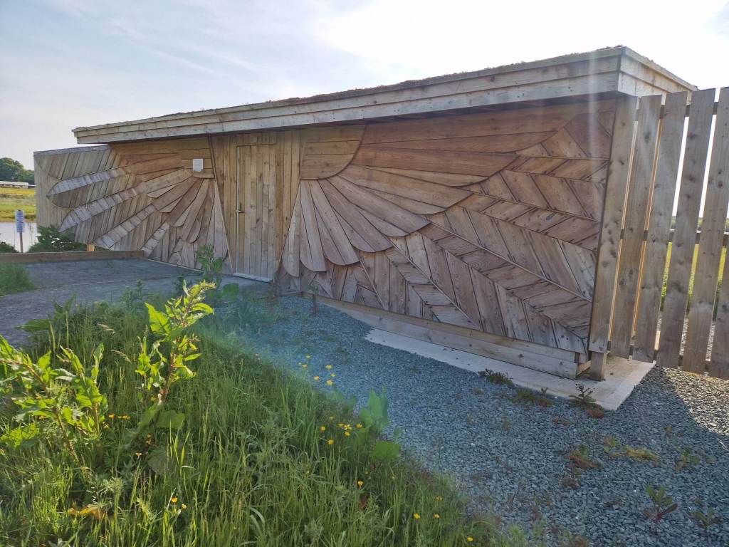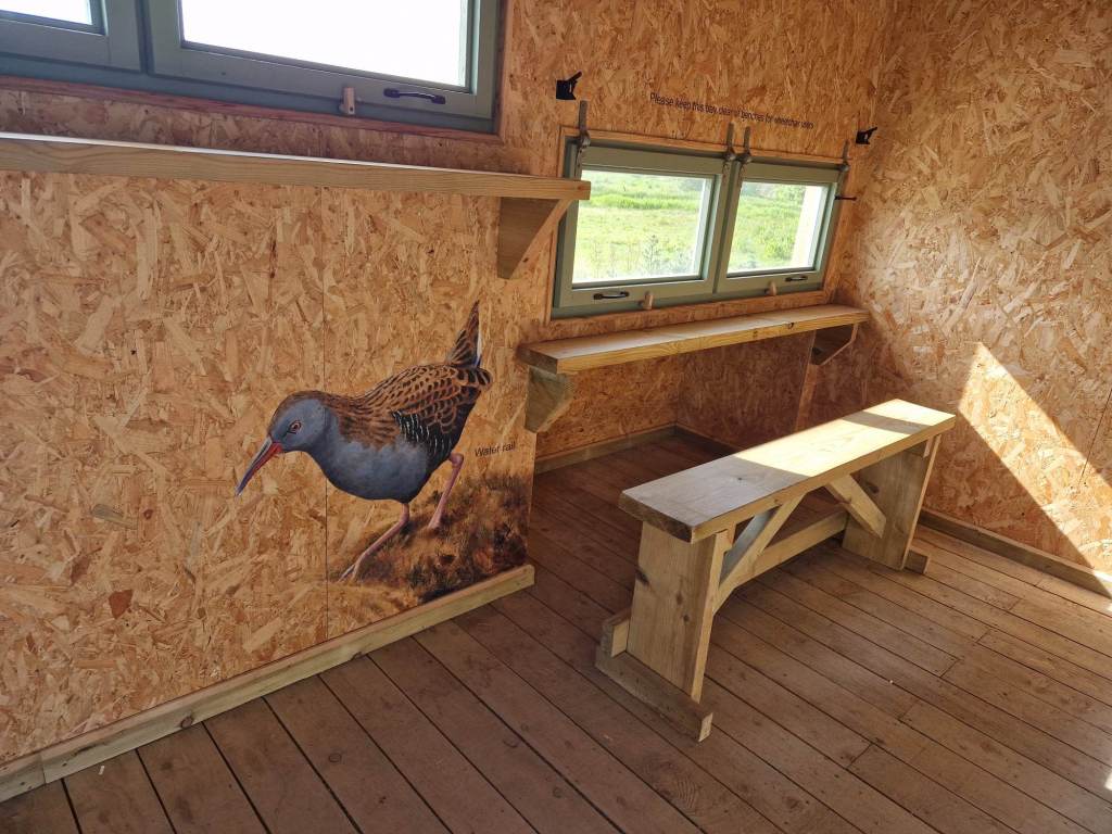 The owl-shaped bird hide was designed by Helen Shackleton and Lloyd Turner. It has wide entrance doors which are accessible for both wheelchair and mobility scooter users. There is a lower latch window enabling people to view birds, to take notes and photographs.
